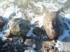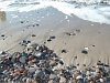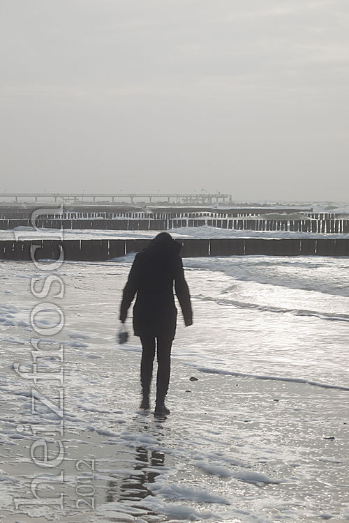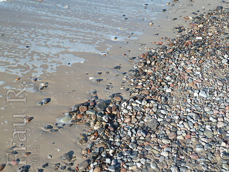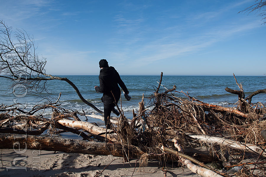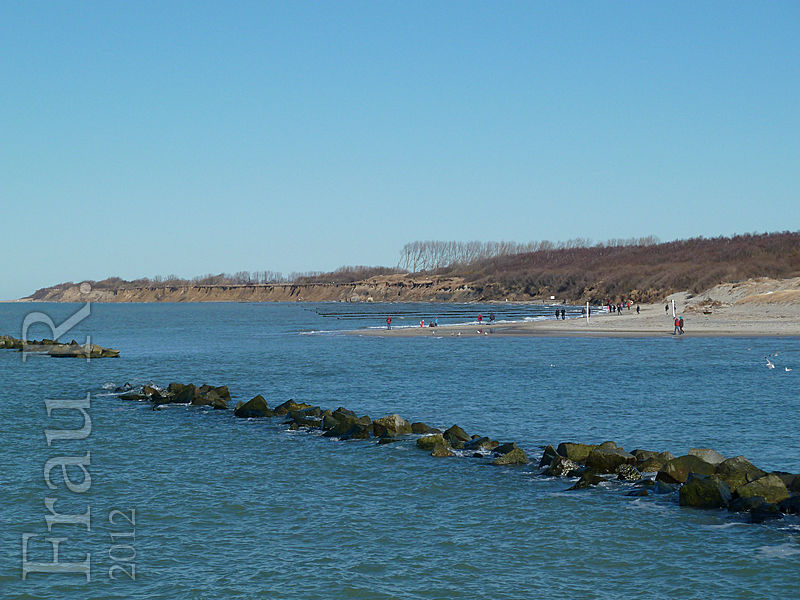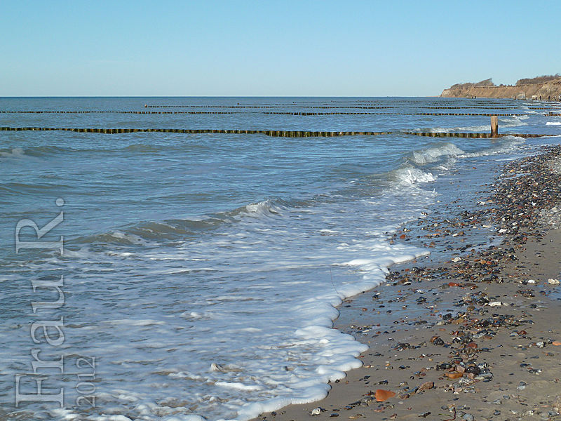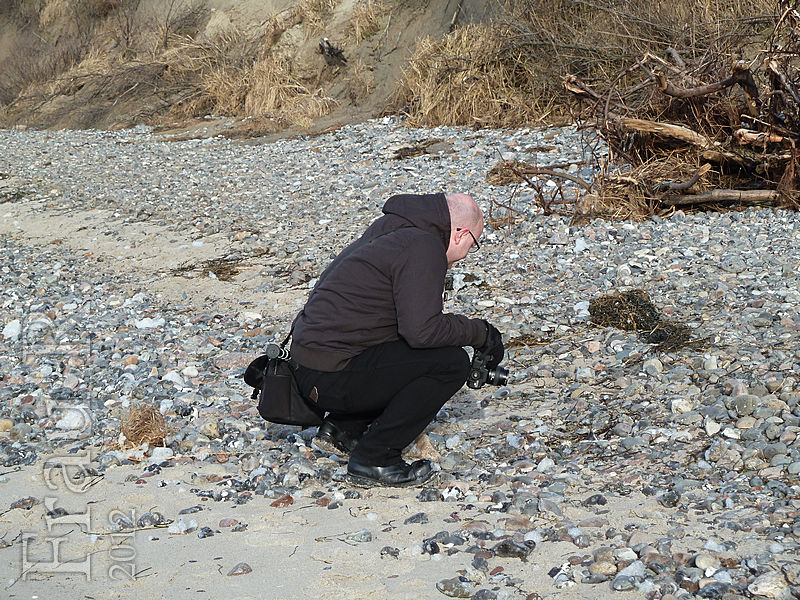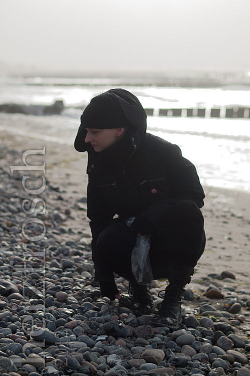 Ich mache mich also allein auf den Weg zur Steilküste. Ausgerüstet mit Fotoapparat, Handschuhen, Mütze, Sonnenbrille und Steinsammeltüte stürze ich mich ins Gewimmel. Ja, Sonntagmittag ist wirklich jeder Tourist aus Wustrow und Ahrenshoop unterwegs. Die meisten versuchen schick auszusehen und sitzen mondän auf Bänken und im Freisitz teurer Cafés. Einige Frauen haben sich extra fein gemacht, müssen aber bald einsehen, dass hochhackige Wildlederstiefel am Strand eher hinderlich sind. Ich hingegen sehe zwar etwas martialisch aus, bin aber für Sand, Wellen und Steinstrand gut gerüstet. Wegen der vielen Touris macht das Steine sammeln nicht so viel Spaß. Irgendwie sehe ich wohl kundig aus und so folgt mir nach einer Weile ein Grüppchen, um nach meinem Vorbild Steine einzusammeln.