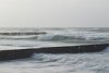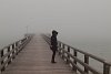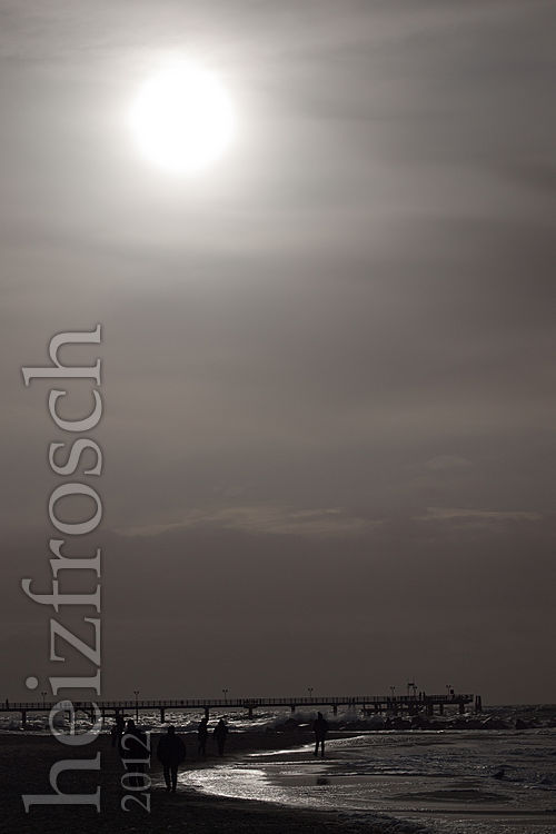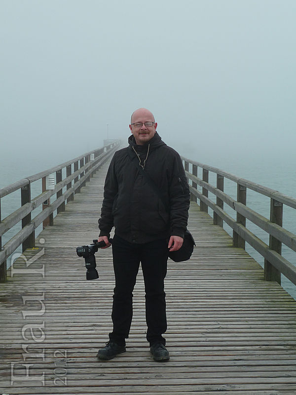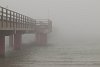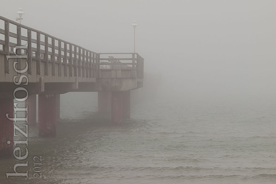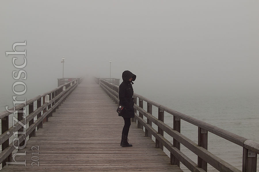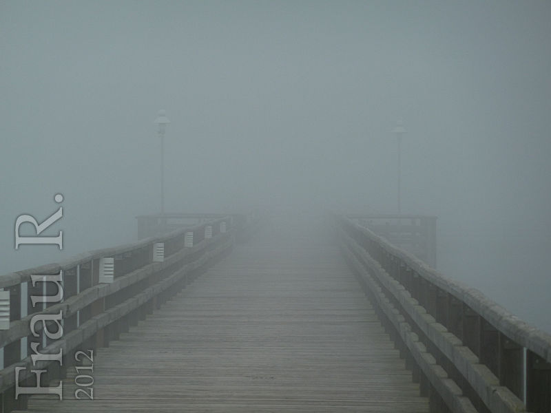 Stattdessen lockt Punkt 2 des Tagesprogramms, eine Tour nach Prerow inklusive einem traditionellen Besuch der »Teeschale«. Am Strand beträgt die Sichtweite 30-50 Meter, und der Wind pustet gehörig. Wir schnudeln trotzdem einmal die komplette Seebrücke hinter und gleich wieder zurück, und dann sammelt Frau R. noch ein paar Muscheln ein. Ich liebe Nebel!