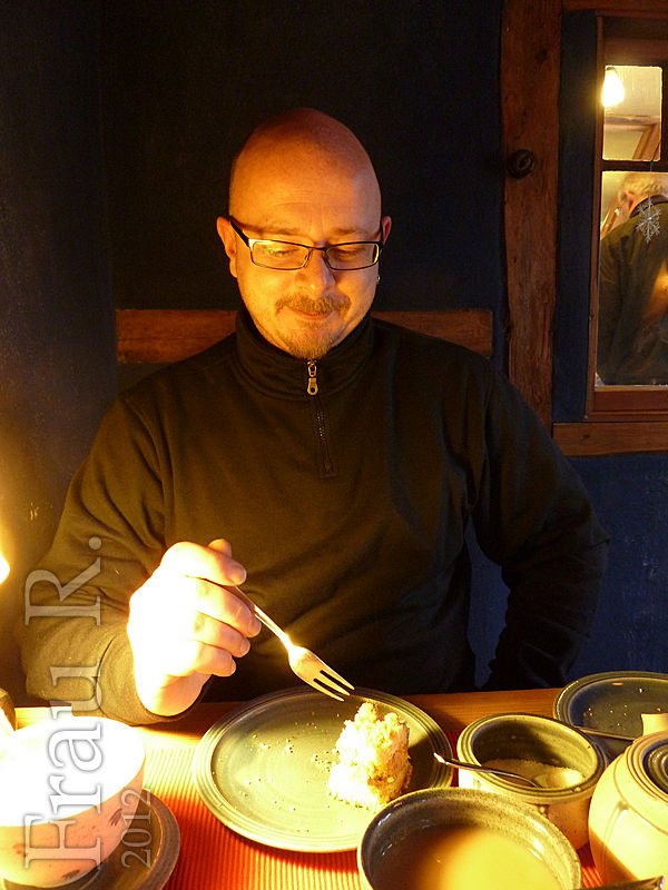 In der Teeschale bekommen wir a) einen Parkplatz(!) und b) auch gleich einen netten Zweiertisch. Die Kuchenstücken sind wie immer riesig, der Tee lecker und der Cappuccino auch nicht schlechter. Und weil wir brav aufessen, reißt am späten Nachmittag tatsächlich die Nebeldecke auf, und die Sonne lässt sich sehen.