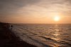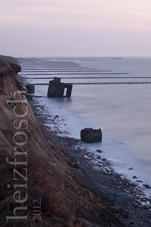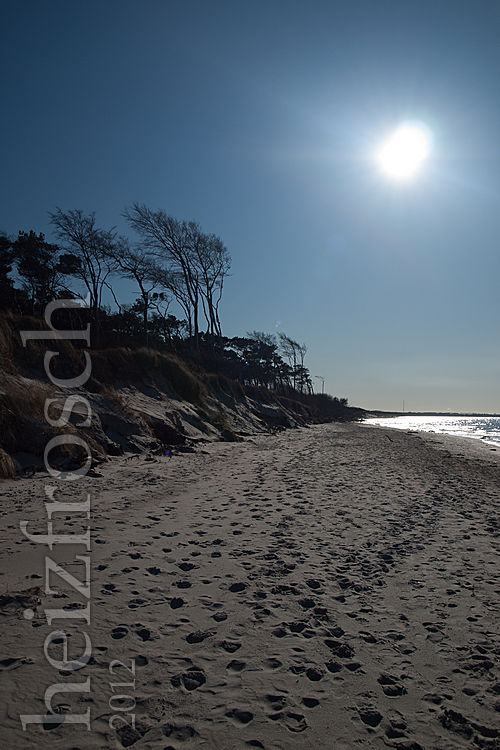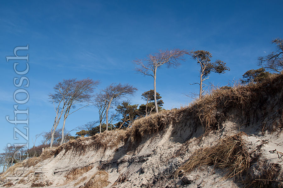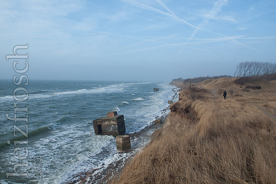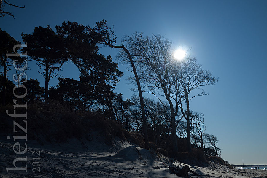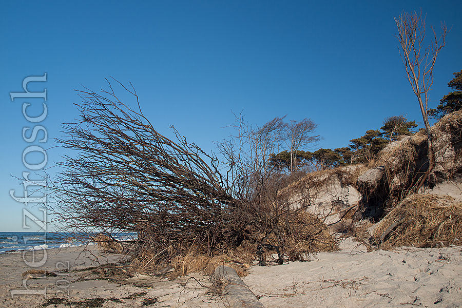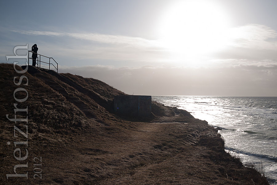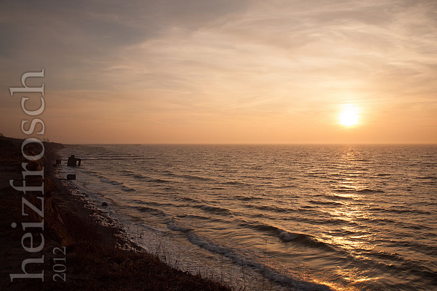 Flink wird in der Fischbude in Ahrenshoop noch ein Abendbrot für den heizfrosch gefangen. Dann wird beschleunigt die Reise ins Häuschen angetreten, weil ich die tiefstehende Sonne nutzen und noch zum Fotografieren ans Steilufer will. Ich schaffe es ca. 15 Minuten vor Sonnenuntergang; bis ganz runter an den Strand komme ich in der Restzeit nicht mehr, und so übe ich an der Abbruchkante fliegen und drücke nebenbei ab und an auf den Auslöser. Durchgefroren, aber zufrieden erreiche ich gegen 18.15 Uhr die Ferienwohnung, und das Abendprogramm kann beginnen.