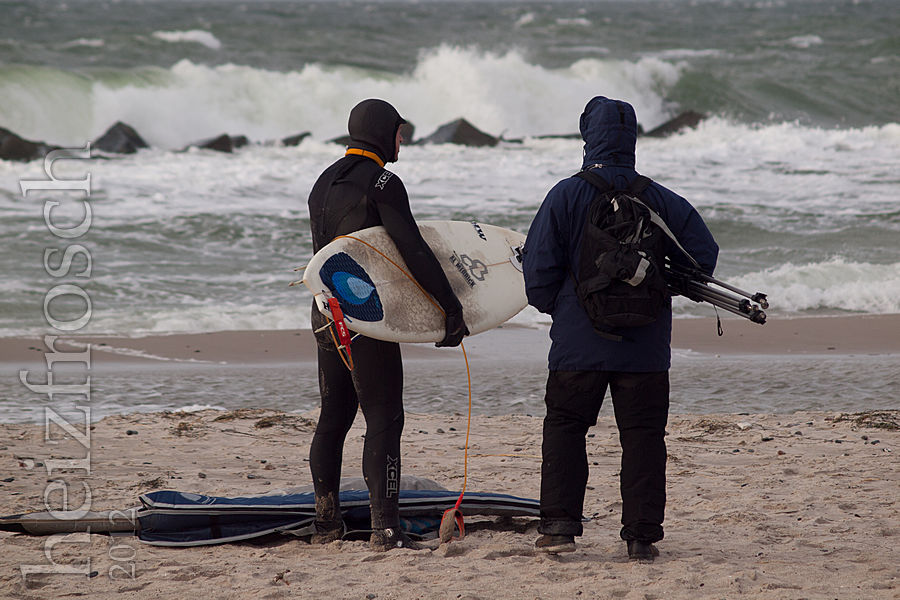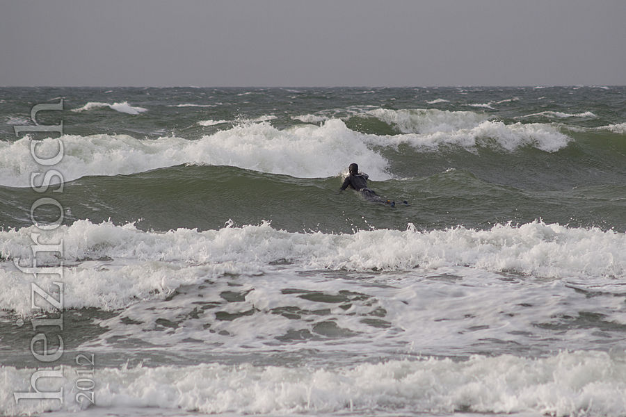 Es ist etwas windig – bzw. es stürmt ziemlich heftig. Kapuzen werden zu Segeln, Brillen verlieren den Kontakt zum Kopf, der Wind treibt einen von links nach rechts und vor und zurück. Die Ostsee schmeißt Schaum übers Land, die Möwen sind im Streik, und mittendrin paddeln kurz vor Wustrow ein paar Surfer durchs kühle Nass. Total gaga!