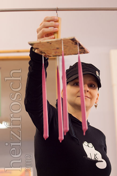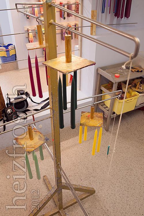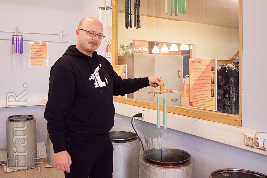 Der Küstenbewohner nennt es Wind, der Städter nennt es Orkan – jedenfalls fegt dieses Etwas heute schon seit den zeitigen Morgenstunden über den Darß, gepaart mit Bähkswolken und Igittregen. Ein perfekter Moment für einen Strandnichtspaziergang, umso geeigneter aber für einen Besuch der »Kerzenscheune« in Niederhagen, ca. 30 km vom Quartier zwischen Ahrenshoop und Rostock gelegen. Dort begrüßt uns die freundliche und sehr resolute Betreiberin, Frau Behm. (Mir machte sie anfangs etwas Angst mit ihrer herrischen Art. Aber wahrscheinlich muss man so sein, wenn man zu Stoßzeiten 20 Blagen auf einmal anleiten muss.) Sie weist uns kurz in die Künste des Kerzenziehens und -gießens ein und überlässt uns unserem Schicksal – jedoch jeweils nur für kurze Zeit, um sich anschließend sehr wortreich über unsere Kunstwerke, unser Geschick, unsere Sinn für Farben und Formen und über einiges weitere aus dem Leben auszulassen. Es werden sehr vergnügliche Stunden, und Frau R. kauft anschließend neben den selbstgemachten Kerzen auch noch den halben Restwarenbestand auf, was bei Frau Behm zu Verzückung und spontanem Vergessen der Verzehrkosten (für eine Schoki ohne Schlagsahne und einen Cappuccino) führt. Selbige bezahlen wir aber Sekunden vor der Abreise auch noch, wir sind ja schließlich gut erzogen worden! Eine Bemerkung der Kerzenscheunenbetreiberin brachte mich zu der Vermutung, dass sie uns zunächst nicht richtig eingeschätzt hat. Denn erst, als sie den Storch-Heinar-Pin an meiner Jacke entdeckte, taute sie etwas auf. Ja, nicht jeder, der Schwarz trägt und keine Haare hat, ist politisch rechts! Aber trotzdem: Ja, ich bin so gefährlich, wie ich aussehe ;-)