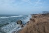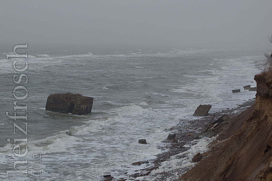 Auf der Rückfahrt hüllt sich das Fischland in Nebel, die Temperatur sinkt während der 20 Minuten Autofahrt um 4 Grad, und da wir das Hohe Ufer bei Nebel noch nicht kennen, wagen wir doch einen Abstecher an die Steilküste. Dort bläst uns der Wind beinahe die Kameras aus der Hand und den Seeschnodder um die Ohren, aber genau deshalb sind wir doch hier: wegen der feuchten Seeluft!